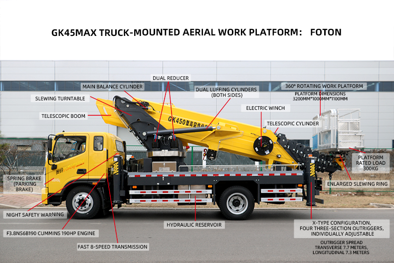 Dibangun pada sasis Foton Aoling dengan mesin Cummins 190HP, GK45 menawarkan ketinggian kerja 45m dan jangkauan 25m. Boom 9 bagiannya memiliki fitur teleskopik sinkron 8 tahap dan rotasi tak terbatas 360°. Outrigger tipe X (bentang 7,7m) memastikan stabilitas yang kokoh. Platform 3200mm yang luas mendukung 300kg, dengan kontrol elektronik penuh, remote nirkabel, dan daya darurat. Fitur keselamatan meliputi alarm kemiringan, pelindung kaki, dan sensor angin. Ideal untuk operasi di dataran tinggi yang menantang.